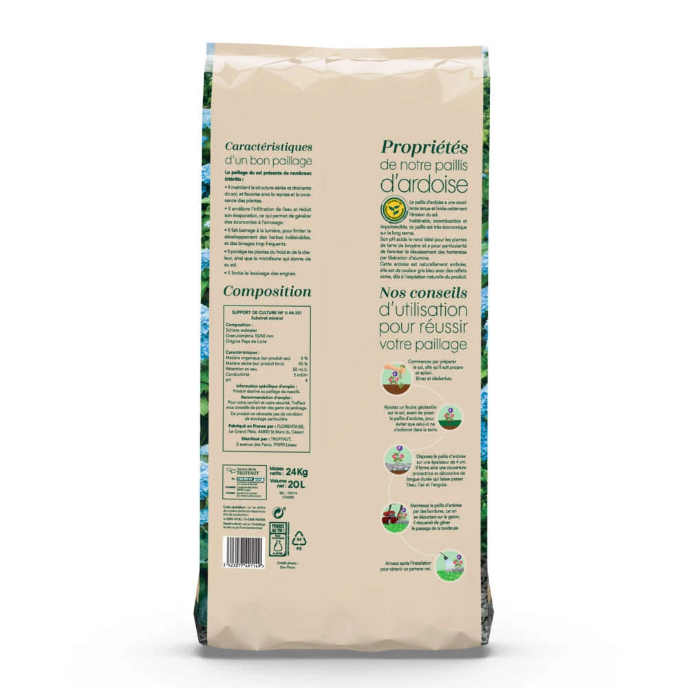 Grâce Ă son poids et Ă l’imbrication des Ă©lĂ©ments, le paillis d’ardoise a une excellente tenue et limite nettement l’Ă©rosion du sol. InaltĂ©rable, incombustible et imputrescible, ce paillis est très Ă©conomique sur le long terme. Son pH acide le rend idĂ©al pour les plantes de terre de bruyère et Ă pour particularitĂ© de favoriser le bleuissement des hortensias par libĂ©ration d’alumine. SĂ©lectionnĂ© pour son aspect ambrĂ©, ce paillis d’ardoise est unique et Ă©pouse la tendance du retour au naturel et aux matĂ©riaux bruts.