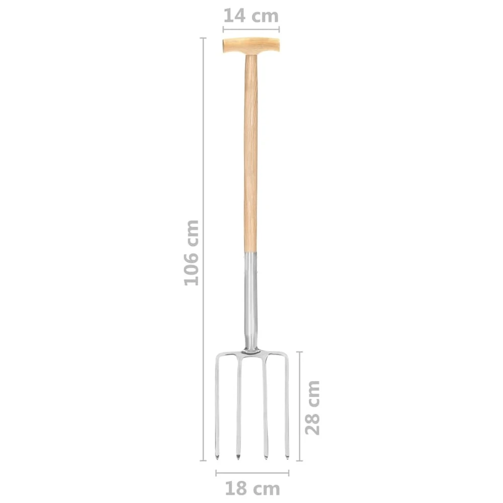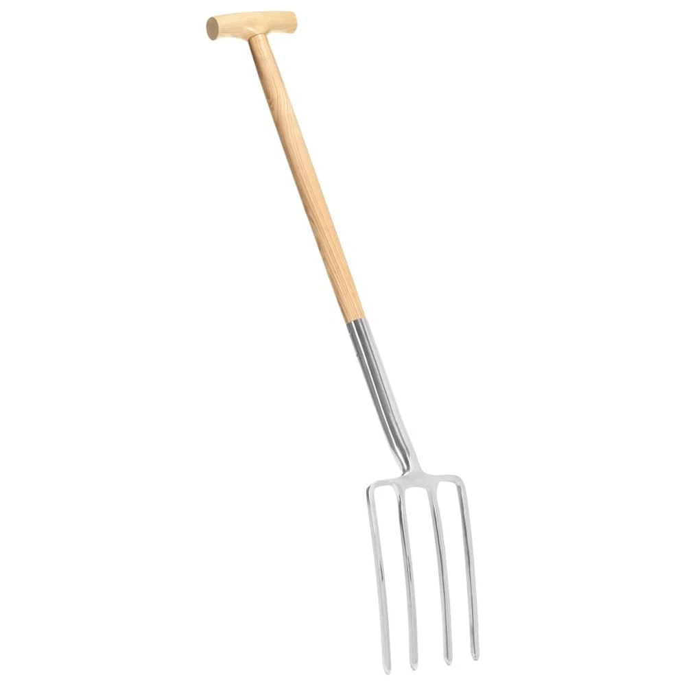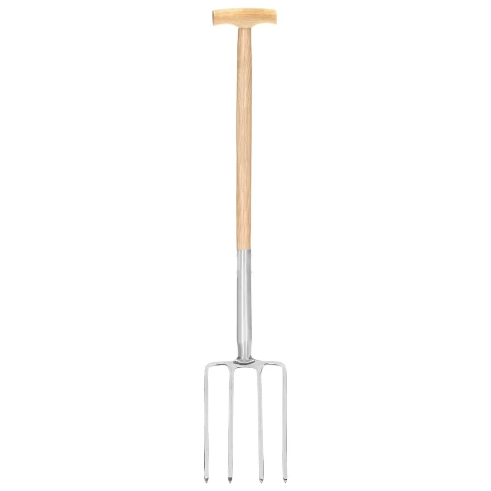 Cette fourche à creuser de jardin est idéale pour la culture, le retournement, l’aération et la décomposition du sol. La tête et les dents sont fabriquées en acier inoxydable pour fournir à la fois la résistance et la durabilité. La finition du revêtement poli offre une meilleure résistance à la rouille, aux rayures, à l’humidité et aux alcaloïdes présents dans le sol. La poignée est en bois de frêne pour une plus grande robustesse et la poignée en forme de t offre une prise confortable.